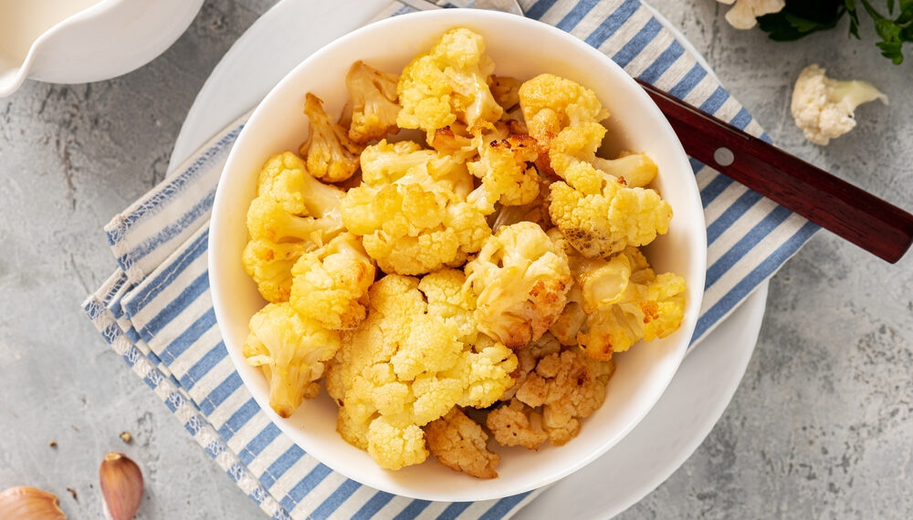 - Preheat air fryer to 400°. In a large bowl, combine first 7 ingredients; toss to coat. In batches if necessary, place cauliflower in a single layer on greased tray in air-fryer basket. Cook until brown and crisp-tender, 8-10 minutes, turning once.