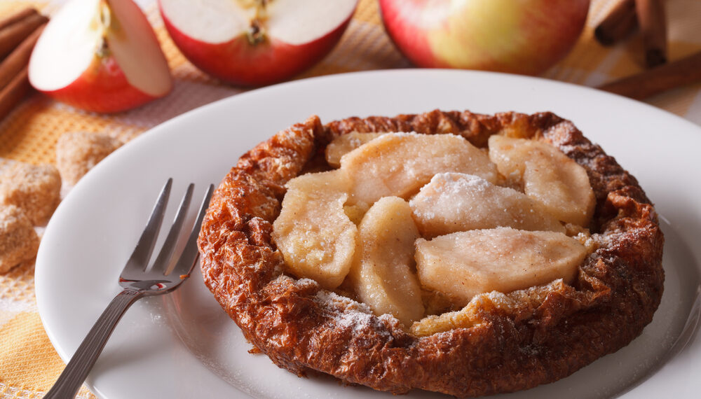 - For topping, in a skillet, combine the apples, butter and sugar; cook and stir over medium heat until apples are tender. Spoon into baked pancake. Sprinkle with confectioners’ sugar. Cut and serve immediately.