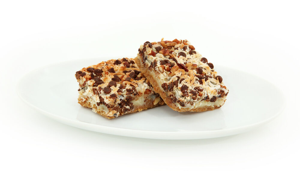 - Preheat oven to 350°. Melt butter in a 9-in. square baking pan. On top of melted butter, sprinkle crumbs, then coconut, then baking chips, then macadamias, then pineapple and then mangoes. Pour well stirred coconut milk over all. Do not stir. Bake until a toothpick inserted in center comes out clean, about 30-35 minutes. Refrigerate at least 4 hours or overnight. Cut into bars and serve.