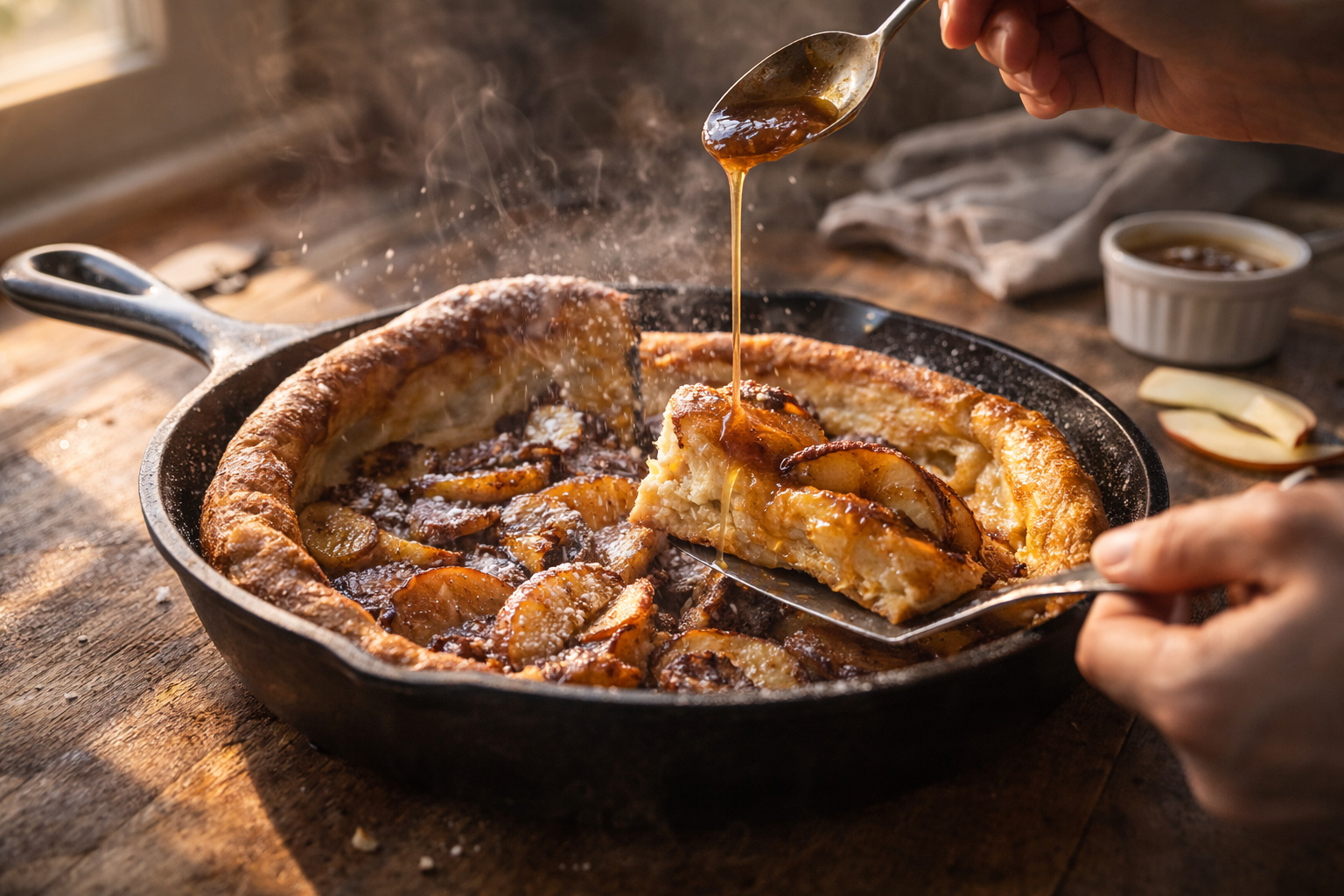 - Remove the skillet from the oven (the pancake will deflate slightly). Drizzle with the warm maple butter, dust with powdered sugar if using, slice into wedges, and serve immediately.
