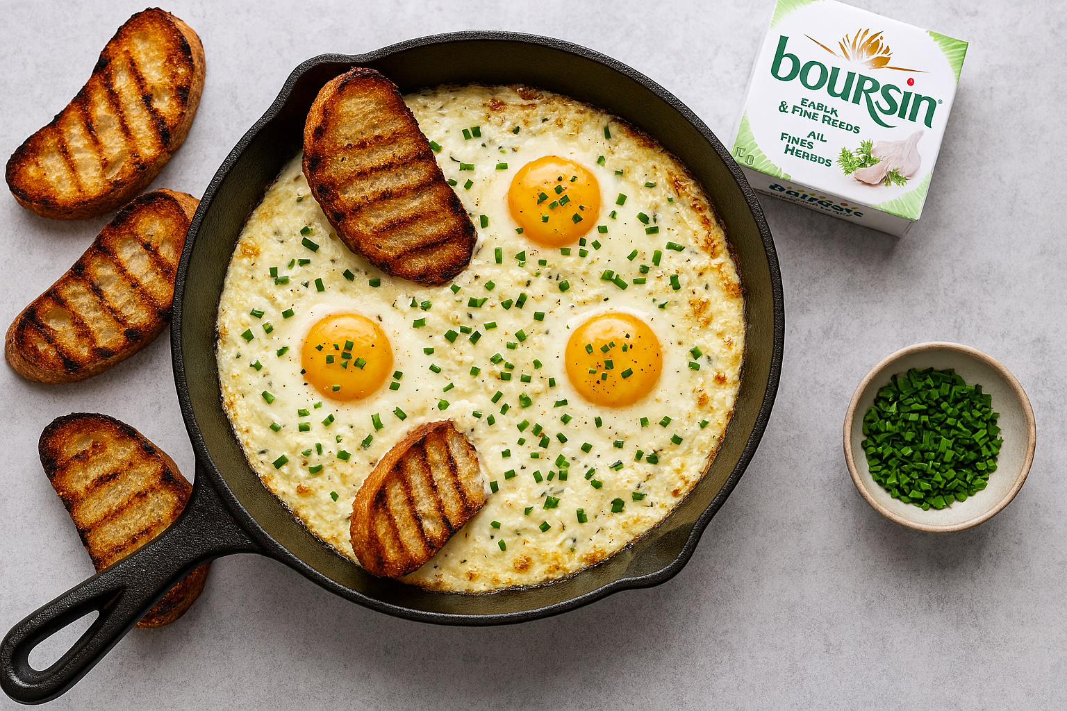 Bake in the preheated oven until the egg white around the block of Boursin is cooked through, about 15 minutes. Yolks may be slightly runny.