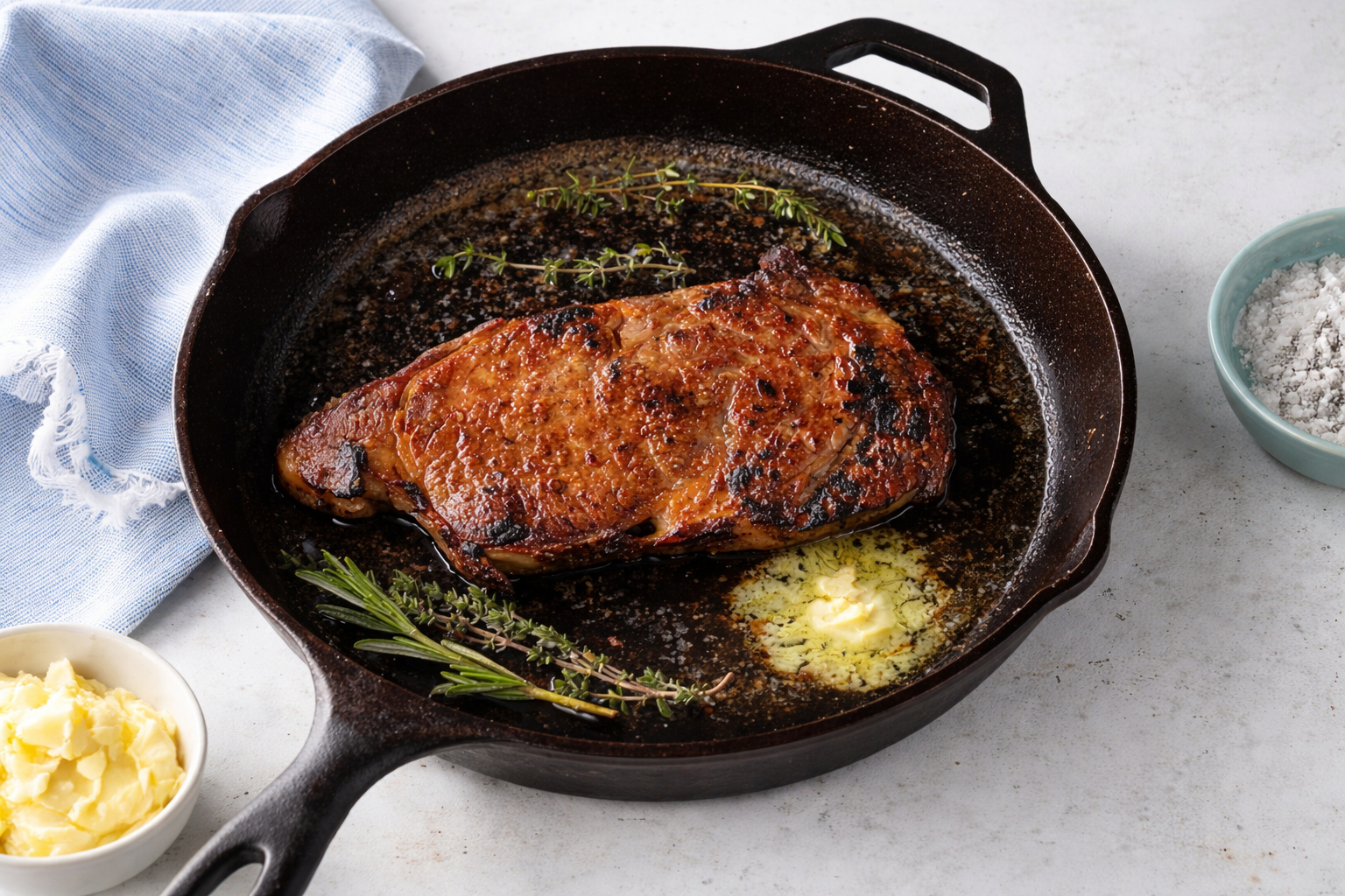 - Preheat a cast-iron skillet over high heat until extremely hot, 4-5 minutes. Sprinkle remaining 1 teaspoon salt in bottom of skillet; pat beef dry with paper towels. Place steak in skillet and cook until easily moved, 1-2 minutes; flip, placing steak in a different section of the skillet. Cook 30 seconds and then begin moving steak, occasionally pressing slightly to ensure even contact with skillet.