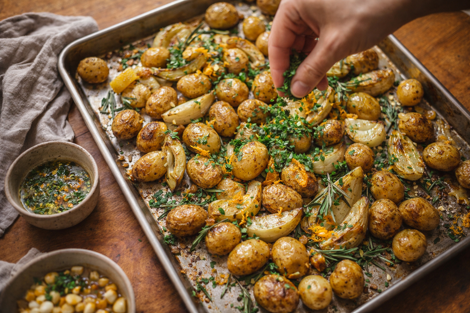 - Add the halved baby potatoes and fennel wedges to the bowl and toss thoroughly so all pieces are evenly coated with the citrus-herb mixture.