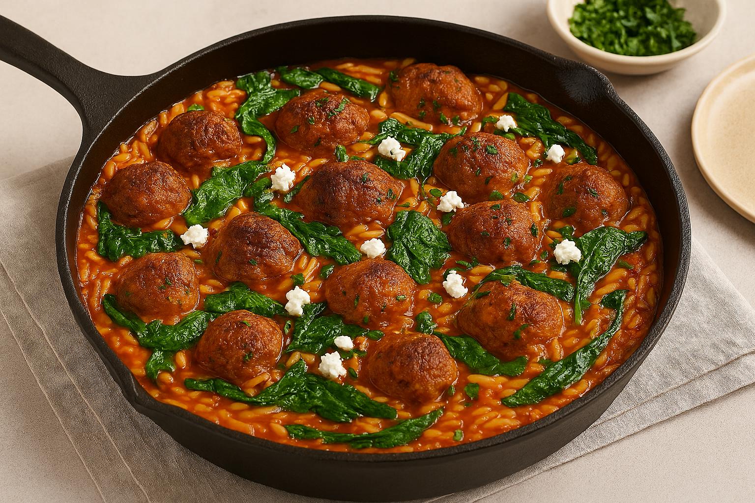 Hearty, herby, and incredibly satisfying, this one-skillet Greek-inspired dish combines juicy, spiced meatballs with tender orzo simmered in a tomato-based sauce. It’s the perfect cozy Main C with Mediterranean flair—and minimal cleanup!