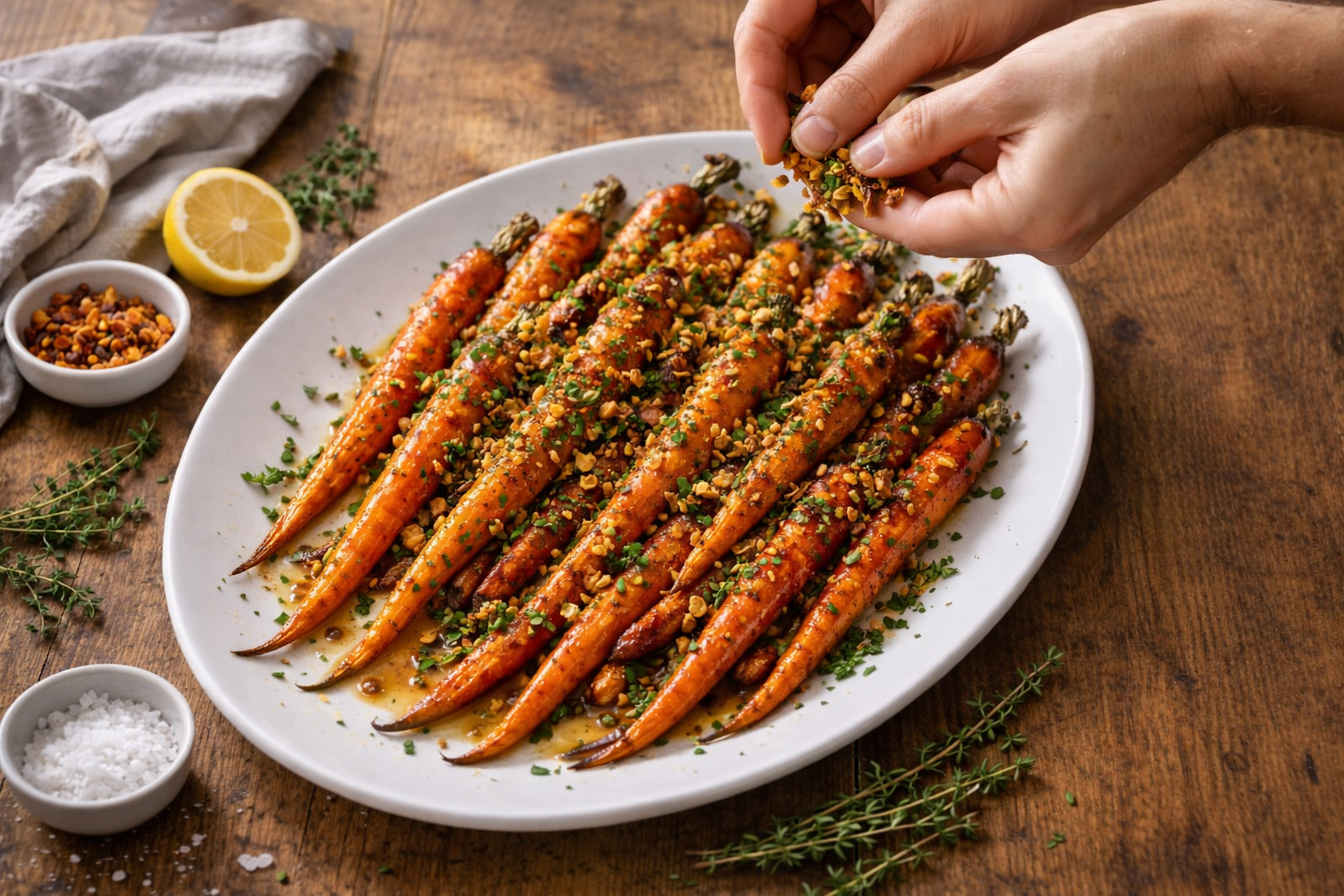 - Plate the carrots, sprinkle generously with crispy shallots, chopped parsley, and a few extra thyme leaves. Serve immediately while warm and crisp.