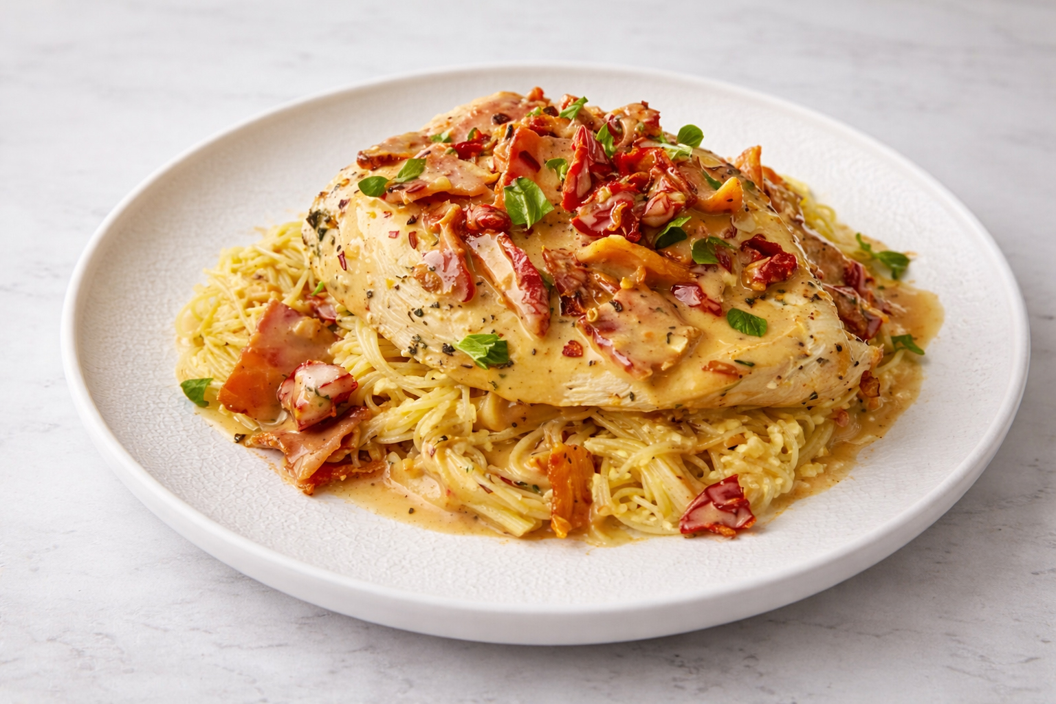 Marry Me Chicken is a rich, comforting dish known for its creamy texture and bold, savory flavors. Tender chicken is cooked until golden, then simmered in a luscious sauce made with cream, garlic, sun-dried tomatoes, and herbs. The combination creates a perfect balance of indulgence and warmth without being overwhelming. Finished with a hint of cheese and fresh herbs, this dish feels special yet simple enough to make at home.