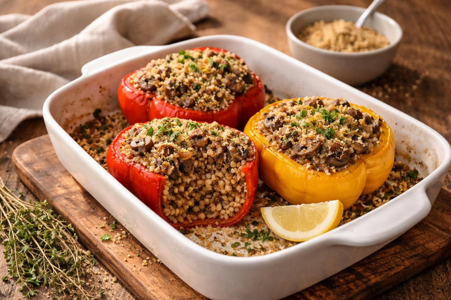 Savory roasted mushrooms and nutty farro fill tender bell peppers for a satisfying, earthy main.