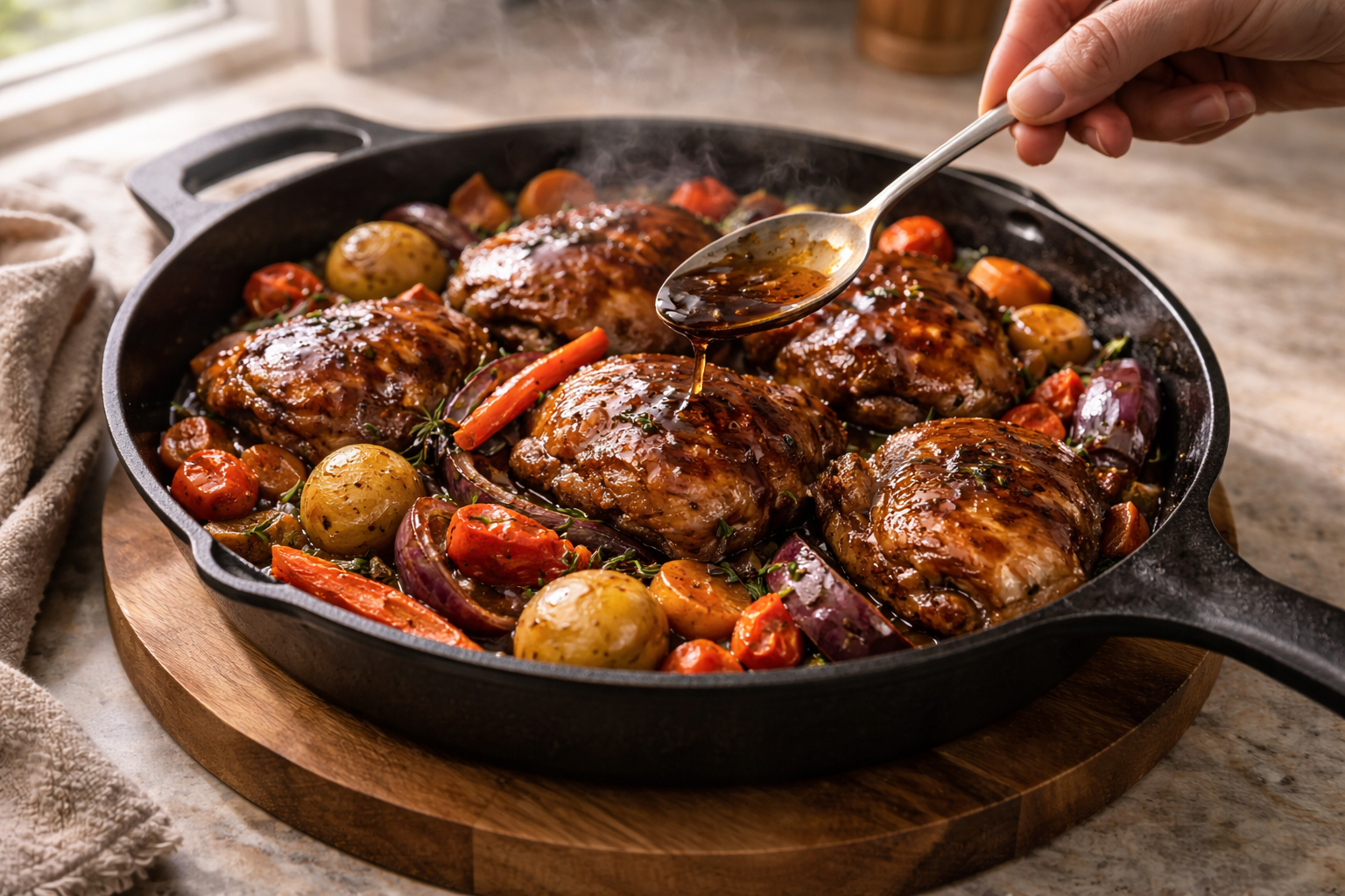 - During the last 5 minutes of roasting, spoon pan juices over the chicken once. If you want a thicker glaze, transfer skillet to broil for 1–2 minutes, watching closely to avoid burning.