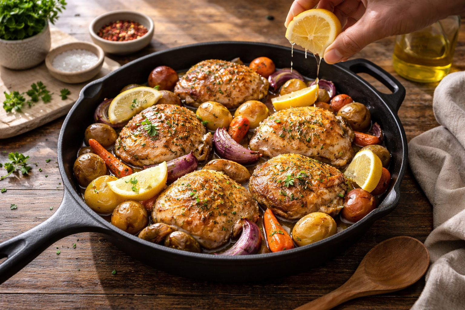 - Remove from the oven and let rest 5 minutes. Squeeze additional lemon over the chicken and vegetables, then sprinkle with chopped parsley.