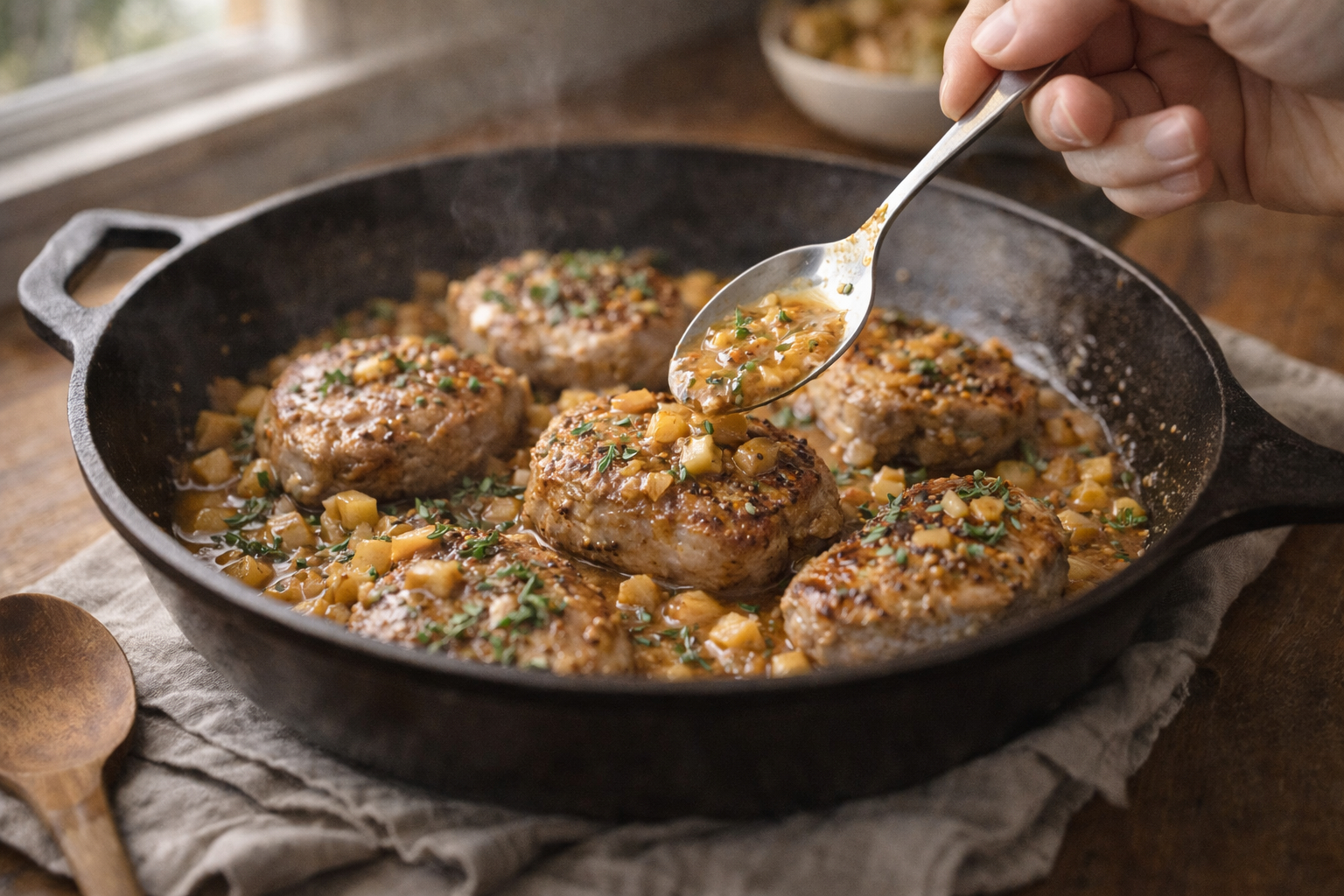 Pan Seared Pork Medallions with Mustard Apple Pan Sauce deliver tender, juicy pork with a crisp golden crust. The sauce is bright and silky, combining tangy Dijon with lightly caramelized tart apple for balanced sweetness. Textures contrast between the soft pork, silky sauce, and scattered fresh herbs. Serve hot alongside roasted potatoes, buttered greens, or a simple grain for an elegant weeknight or dinner-party main.