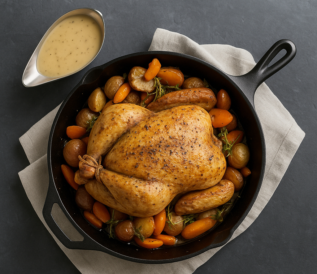 This one-pan roast chicken dinner delivers everything you crave: crackly, golden skin, juicy, tender meat, and caramelized carrots and potatoes that roast right in the pan. When the chicken rests, those savory drippings transform into a silky, creamy herb gravy—no extra pot required. It’s cozy, classic comfort with weeknight-easy cleanup.