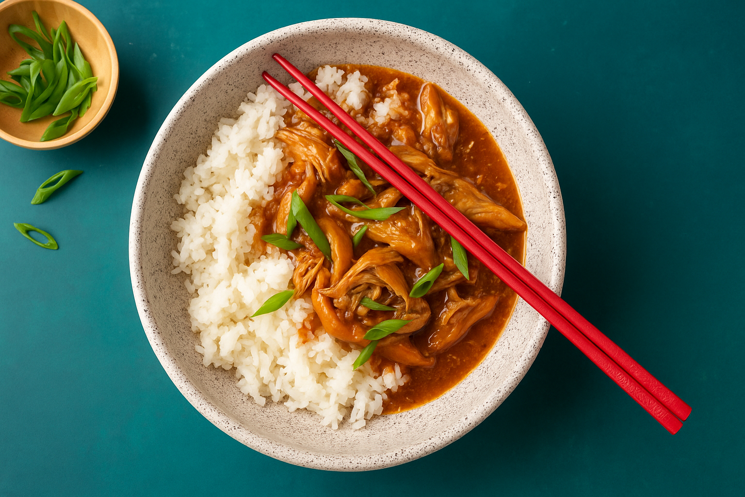 - Serve chicken over rice; garnish with green onion and sesame seeds.