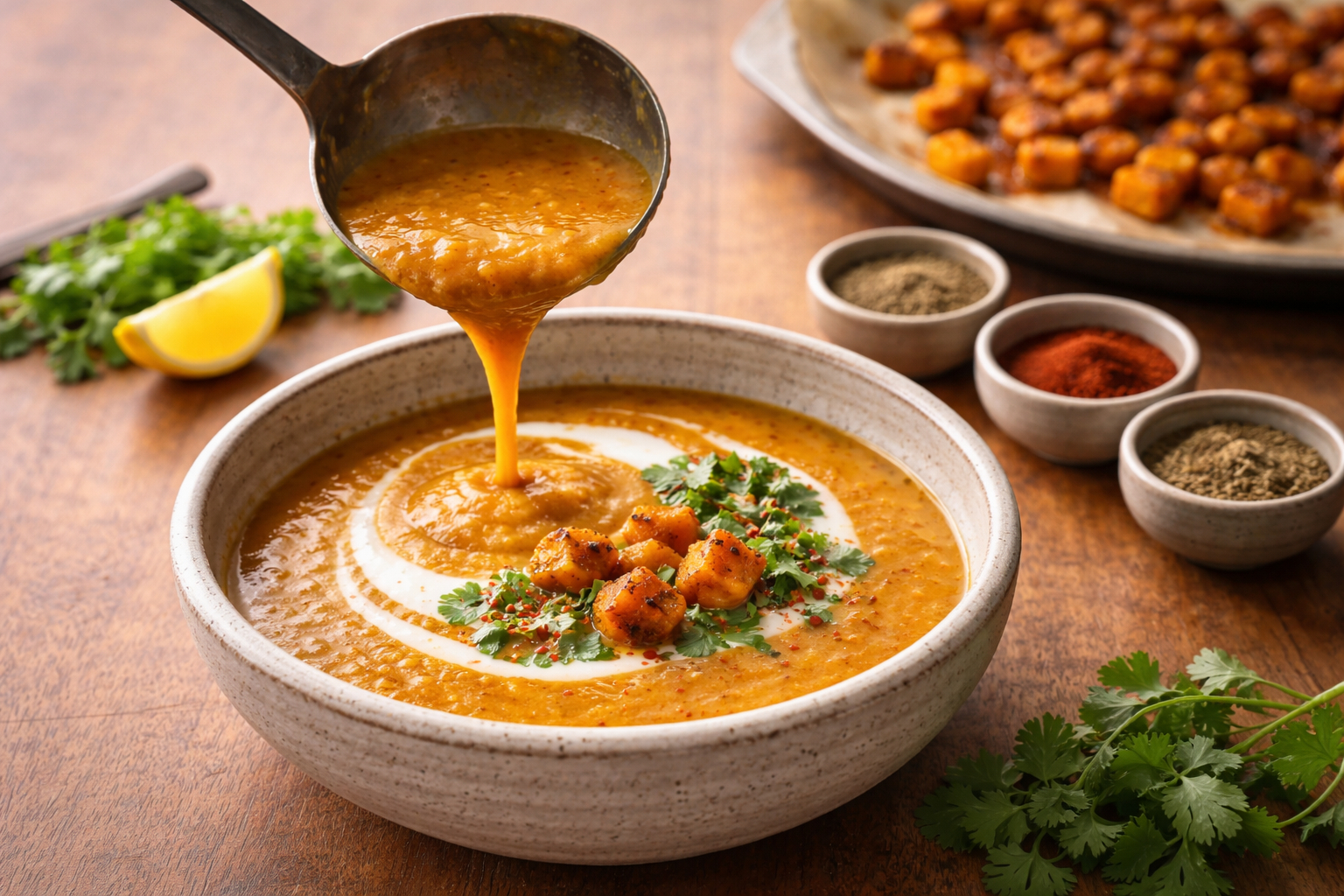 Warm, velvety pumpkin meets tender red lentils for a hearty texture.
