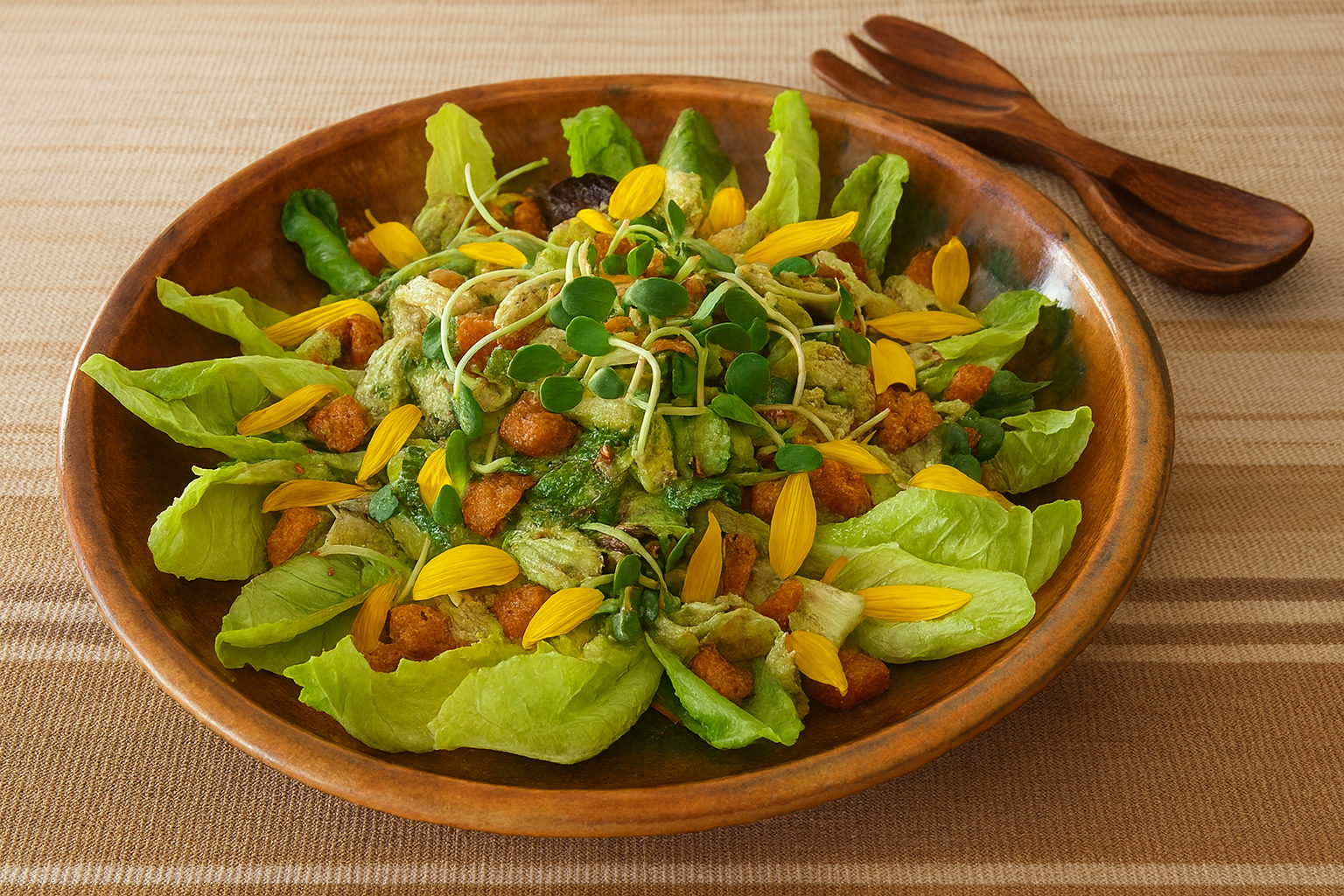 This Sunflower Caesar Salad highlights the incredible versatility of the sunflower in a fresh and flavorful dish. The creamy dressing is crafted with sunflower kernels and oil, while the crisp lettuce is paired with vibrant sunflower sprouts and delicate petals for a bright finish. It’s a simple, elegant salad that can also be made completely vegan.